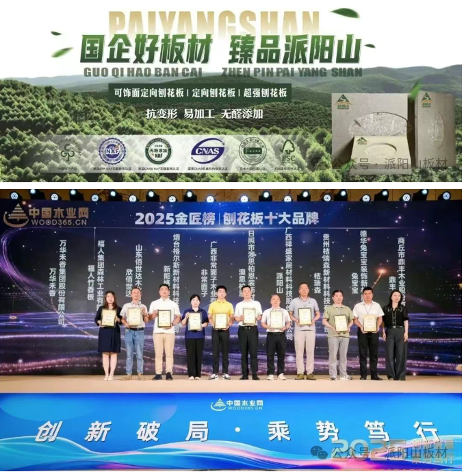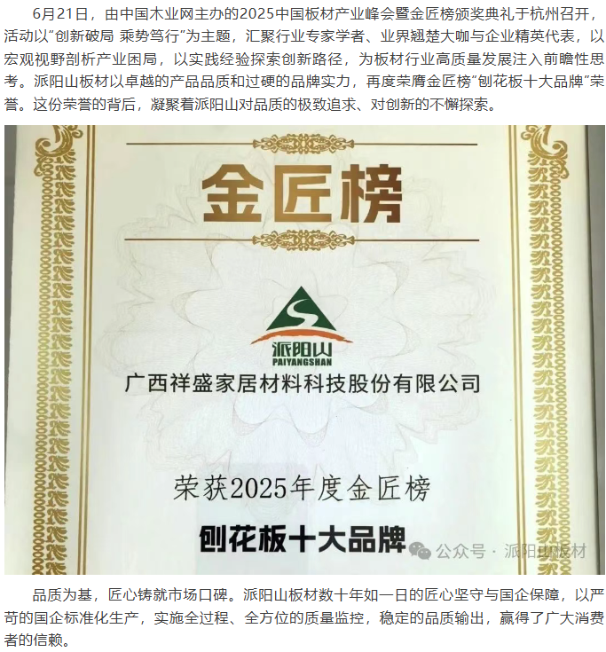 品质为基 创新为先|派阳山板材再度荣膺金匠榜“刨花板十大品牌”荣誉