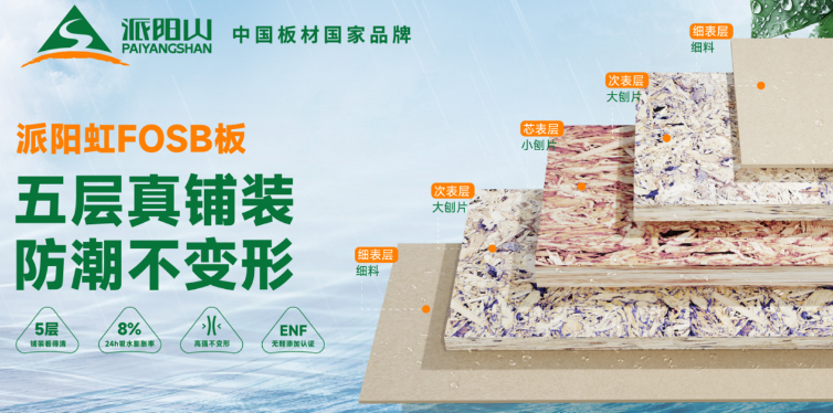 派阳虹FOSB板 ,五层真铺装,防潮不变形。其凭借彩虹般绚烂的彩芯铺装效果,在众多板材产品中脱颖而出,其独特的内芯彩虹设计为家居空间增添了一份别样的时尚感与艺术气息。同时,它还具备出色的防水防潮防霉性能,能够适应各种复杂的家居环境,解决了消费者对于板材在潮湿环境下使用的担忧。