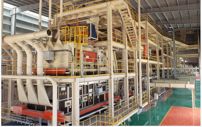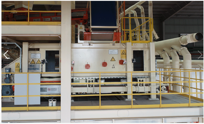 定向铺装机是将施胶后的刨花铺装成型的设备。不同大小规格的刨花根据不同的生产速度需求,在计量箱内均匀下料,通过铺装机内的打散辑及定向轮,按照表层刨花纵向铺装,芯层刨花横向铺装,均匀落在铺装机下的成型皮带上,形成纵横交错的板坯,达到最佳的物理力学性能。